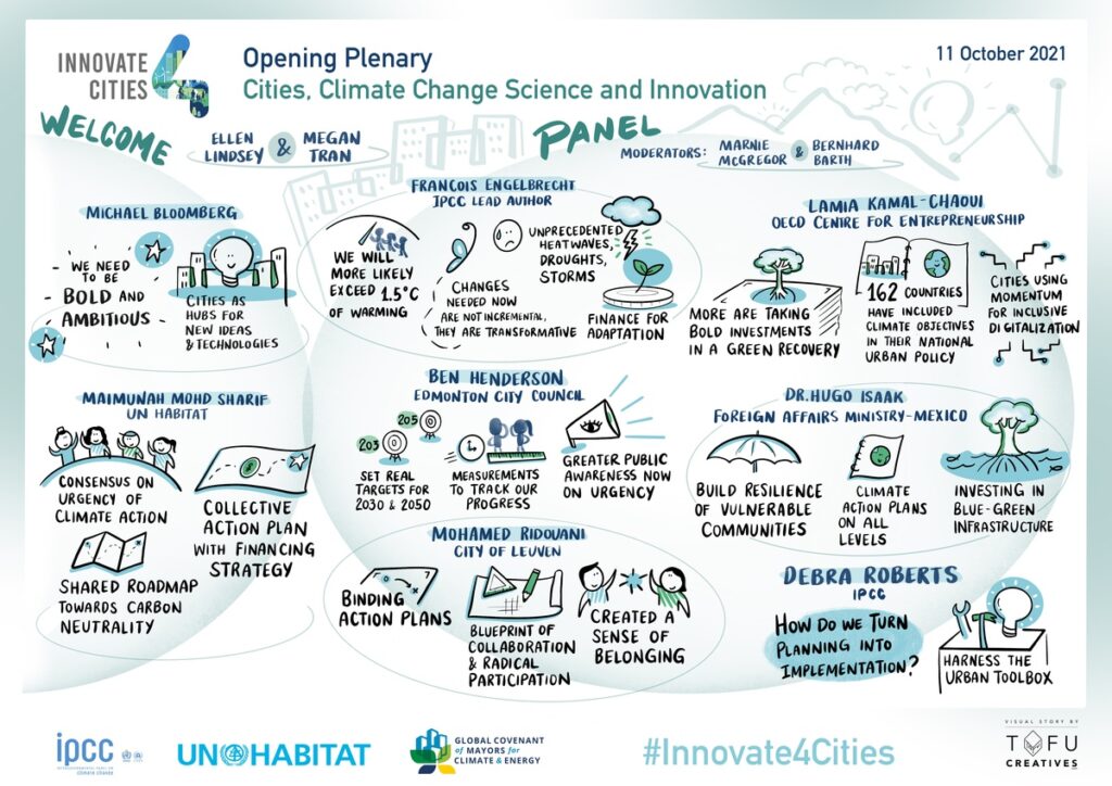 Building on the 2018 Edmonton Cities and Climate Change Science Conference and the resulting Global Research and Action Agenda (GRAA) on Cities and Climate Change Science, the Innovate4Cities 2021 Conference (I4C 2021) focused on the nexus of science, practice, and innovation – including local challenges, priority needs, and cross-sector opportunities to realize ambitious climate action. Against the backdrop of a green recovery from COVID-19, I4C 2021 raised local and regional voices – localizing efforts to build back better towards a cleaner, more resilient, sustainable society and a fairer world. The Innovate4Cities 2021 Conference was co-hosted by the Global Covenant of Mayors for Climate & Energy (GCoM) and UN-Habitat, and co-sponsored by the Intergovernmental Panel on Climate Change (IPCC).